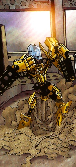 Dieser Körper – Mata Nuis neuer Körper – versuchte, zu gehen, was ihm anfangs noch ein wenig schwer fiel. Auch wäre er fast auf den Käfer getreten. Dieser war jedoch nicht wütend, sondern nur neugierig auf die Maske, die Mata Nui trug. Als er sie jedoch berühren wollte, verwandelte sie ihn in eine Waffe – ein Schild – für Mata Nui.