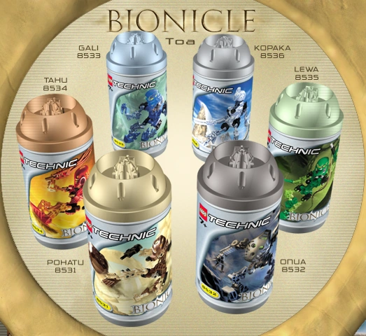 El empaquetado de los sets de Toa Mata fueron diseñados para parecerse a Cilindros Toa. Un contenedor plástico, que contenía fotos y dibujos del producto que podía rotarse para mostrar el set y detalles de la historia a través de papel transparente sobre otro papel.