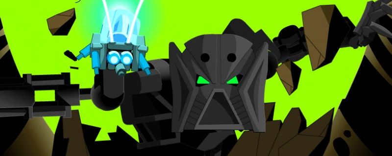 "Ahora la máscara del Toa del Hielo brillaba también, de repente, grandes piedras fueron arrancadas de una pared de la celda de la prisión. Las rocas volaron rápidamente a través de la habitación para formar una pared entre Onewa y Whenua."