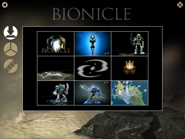 En la esquina superior izquierda de la pantalla hay tres botones. El primero de ellos enlaza a nueve diferentes fondos de pantalla descargables para el escritorio, con fotos de Mata Nui, Makuta, la Kraata, Takanuva, y el Rahkshi con el cual fue incluido el CD.