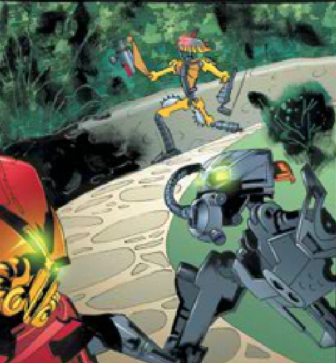 Nuparu, Hahli y Hewkii combatiendo a los Rahkshi en Metru Nui