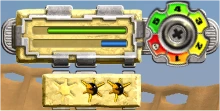Pelin mittarit. Elämälaskuri on numeroitu kiekko yläoikealla. Energiapalkki on vihreä ja Thornaxin latausmittari sininen. Alla näkyy, kuinka monta Thornax-ammusta on jäljellä.