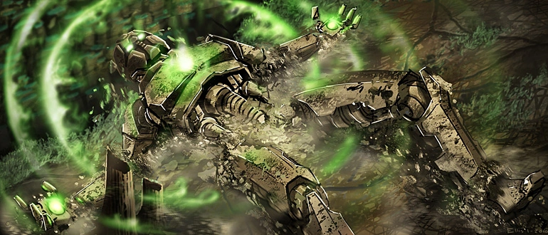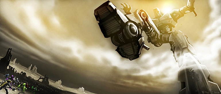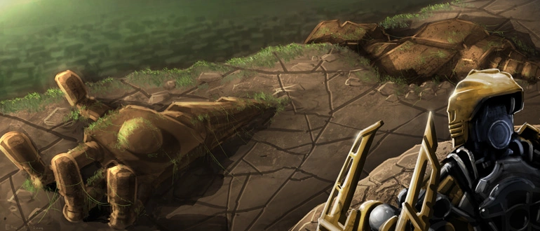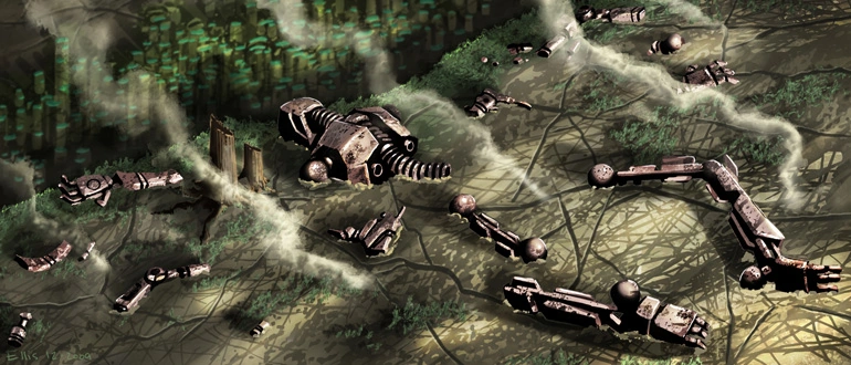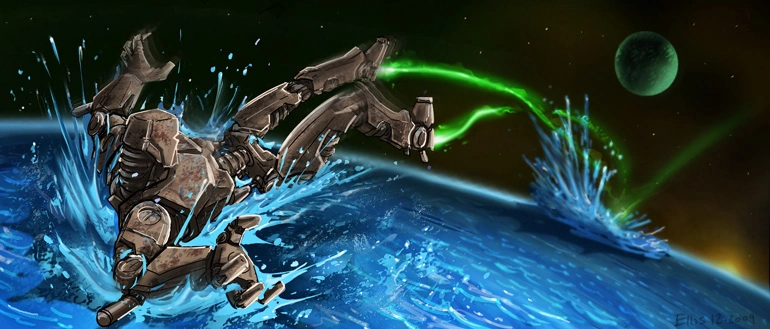 Tajutessaan maailmaansa uhkaavan vaaran viisaat mutta erehtyväiset Suuret Olennot rakensivat jättiläisrobotin pelastaakseen planeettansa. Heidän energianlähteensä oli kuitenkin epävakaa, ja räjähdys sinkosi metallijättiläisen osia eri puolille planeettaa.