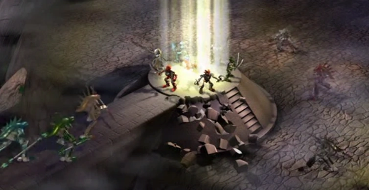 A big Matoran head made of stone is featured in the front of the sandpit. Later, when Takua became Takanuva, he blasted the head with his light powers and some stone from the surface rumbled and came off, making it the shape of a Pakari, Takua's mask.