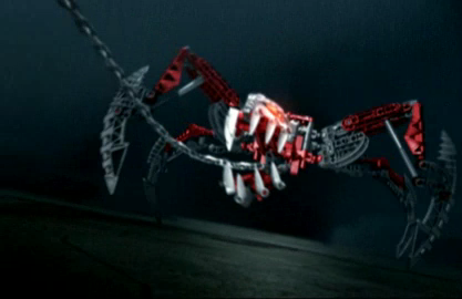 Fenrakk were a species of arachnid-like Rahi with acidic saliva. The most well-known Fenrakk was enlarged by the Mask of Life and forcibly fused to Vezon in order for him to better guard the Mask. The Mask of Life also gave both Vezon and this Fenrakk the ability to absorb kinetic energy, allowing them to grow stronger with every physical attack made by them or against them. This ability made the two unaffected by all physical blows (as they immediately grow strong enough to withstand the attack), and the mask also granted them protection from other dangers such as lava.