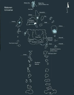 | Mata Nui • Metru Nui • Karzahni • Xia • Zakaz • Odina • Northern Continent Southern Continent (Voya Nui • Mahri Nui) • Karda Nui • Destral • Daxia • Stelt • Artakha • Tren Krom's Island • Nynrah • Visorak • The Pit Southern Islands • (Artidax • Keetongu and Tahtorak's Homeland) | ||||